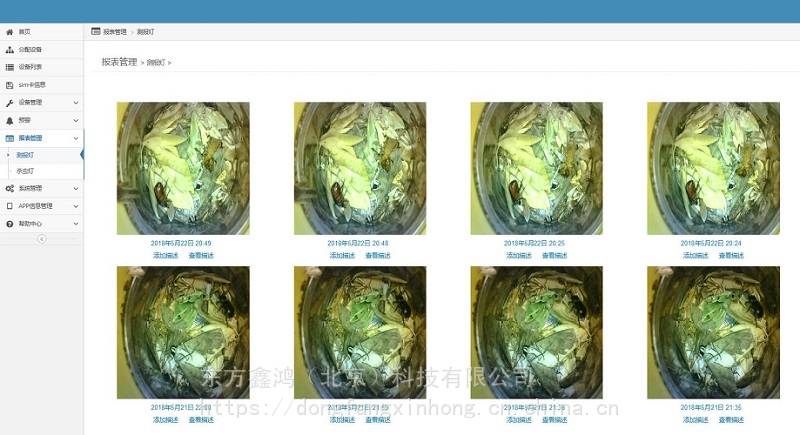 自動蟲情測報燈(可視化)利用現代光、電、數控技術,實現了在無人監管的情況下,能自動完成誘蟲、殺蟲、收集、分裝、排水等系統作業,通過GPRS移動無線網絡,定時拍照采集接蟲盒內收集的蟲體圖片,自動上傳到遠程物聯網監控平臺,平臺每天自動記錄采集數據,形成蟲害數據庫,可以通過數據列表和圖表的形式展現,工作人員可隨時遠程了解以蟲體的情況和變化,制定防控措施。
